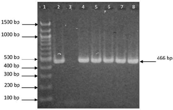 Agarose gel electrophoresis of the PCR products specific for the domain Bacteria (466 bp). DNA was isolated from the water and the rinsed solid samples taken from the open blisters. Lanes: 1—DNA marker (100 bp ladder); 2—10 ng DNA from Lacbacillus spp. (positive control); 3—negative control (no DNA); 4—water from the reservoir; 5—water from the open blister; 6—asphalt; 7—asphalt with mastic remnants; and 8—crumbled aggregate.