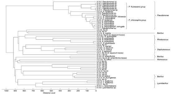 The bacteria from the solid samples grew in 42 morphotypes. The most complex bacterial compositions were found on the asphalt (11 morphotypes), asphalt with mastic remnants (12 morphotypes), and crumbled aggregate (19 morphotypes) (Table 2, Groups III–V). They were classified into 6 genera (Pseudomonas, Bacillus, Lysinibacillus, Staphylococcus, Rhodococcus, and Micrococcus) and 12 species. A total of 9 morphotypes were identified in terms of genus only (ambiguous species identification), whereas 16 morphotypes have yet to be identified. The high bacterial diversity is demonstrated in the dendrogram in Figure 4.