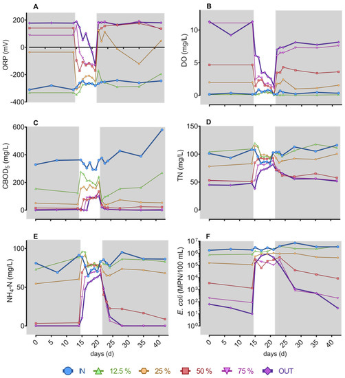 Water quality profiles of selected conventional wastewater parameters such as oxidative reduction potential (A), dissolved oxygen (B), carbonaceous biochemical oxygen demand (C), total nitrogen (D), ammonia nitrogen (E), and E. coli (F) during experimental phase. Grey shaded areas represent days with aeration, no shading represents the interruption phase. Samples were taken at the wetland influent (IN), fractional distances 12.5%, 25%, 50%, 75%, and the wetland effluent (OUT).