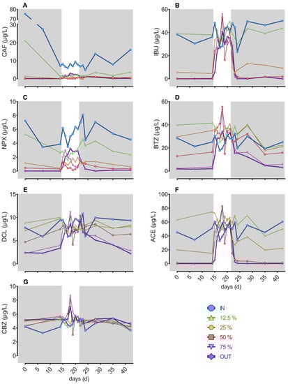 Concentrations of caffeine (A), ibuprofen (B), naproxen (C), benzotriazole (D), diclofenac (E), acesulfame (F) and carbamazepine (G) over the course of the experiment. Shown are the concentrations of IN and OUT as well as the internal profile concentrations at 12.5%, 25%, 50%, and 75% of the fractional length. Grey shaded areas represent days with aeration, no shading represents the interruption phase.
