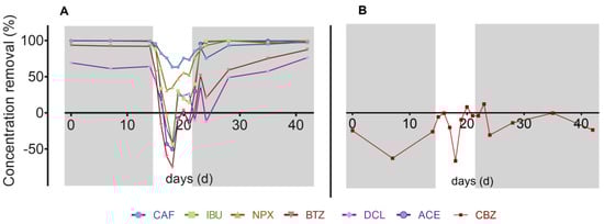 Concentration removal of indicator CECs CAF, IBU, NPX, BTZ, DCL, ACE shown in (A), and CBZ (B). Grey shaded areas represent days with aeration, no shading represents the interruption phase. Internal profiles for each CEC concentration percent removal are provided in Figure S3.