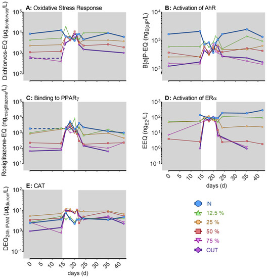 BEQs of oxidative stress response (A), activation of AhR (B), binding to PPARγ (C), activation of ERα (D), and CAT (E). Shown are the BEQs of IN and OUT as well as the internal profile BEQs at 12.5%, 25%, 50%, and 75% of the fractional length. Grey shaded areas represent days with aeration, no shading represents the interruption phase. For visualization dotted line was manually added in two circumstances, where no effect was observed because of invalid data (masking effects and cytotoxicity) on Day 14 for AREc32 (OUT) and PPARγ (IN).