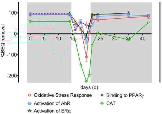 BEQ removals of oxidative stress response (AREc32), activation of AhR (AhR), activation of ERα (ERα), binding to PPARγ (PPARγ), and combined algae test (CAT) after treatment. Grey shaded areas represents days with aeration, no shading represents interruption phase. Internal profiles for each BEQ removal are provided in Figure S5. For visualization dotted line was manually added in two circumstances, where no effect was observed because of invalid data (masking effects and cytotoxicity) on Day 14 for oxidative stress response (OUT) and binding to PPARγ (IN).