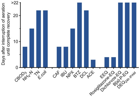 Overall, the recovery for the classical wastewater parameters, micropollutants, and bioassays varied (Figure 6). While CBOD5 and NH4-N showed rapid recovery (<15 days), E. coli and TN did not fully recover until the end of the investigated recovered-baseline phase (22 days). The readily biodegradable micropollutants (CAF, IBU) removals recovered in short time (<8 days). Of particular note is the short removal recovery time for ACE (four days) to a high removal efficacy (>98%). In the literature ACE has been considered as moderate biodegradable with a highly variable removal efficacy depending on the temperature [46,47]. In a one-year study of a municipal wastewater treatment plant and an aerated horizontal subsurface flow treatment wetland, Kahl et al. [46] observed differences in removal efficacies between winter (<15%) and summer (95%). A resilience test conducted under cold (winter) conditions would likely show a longer recovery time for acesulfame removal.