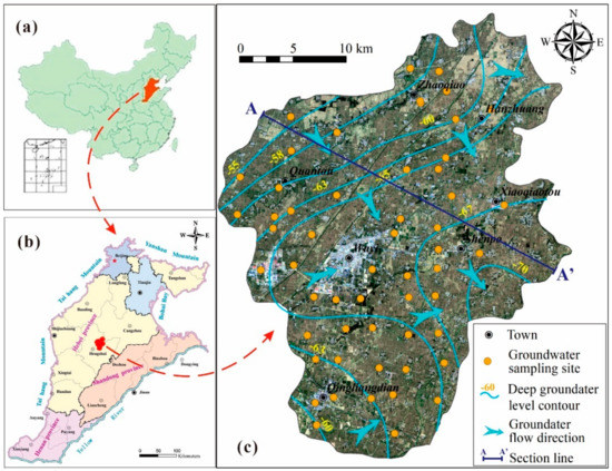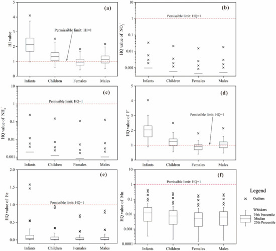 - Yin, S.; Xiao, Y.; Han, P.; Hao, Q.; Gu, X.; Men, B.; Huang, L. Investigation of Groundwater Contamination and Health Implications in a Typical Semiarid Basin of North China. Water 2020, 12, 1137. [Google Scholar] [CrossRef]
