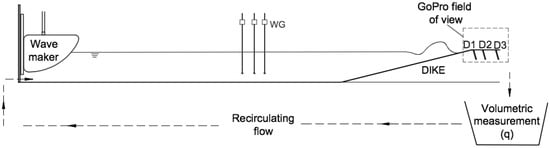 The experimental characterization of the interactions between waves and dikes in terms of water depths, velocities, loads, and overtopping discharges remains a challenging issue due to the unsteady non-linear dynamics, like breaking, turbulence, and air entrainment [,], as well as over-washing processes, eventually alternating wet and dry conditions on the crest [,,,].