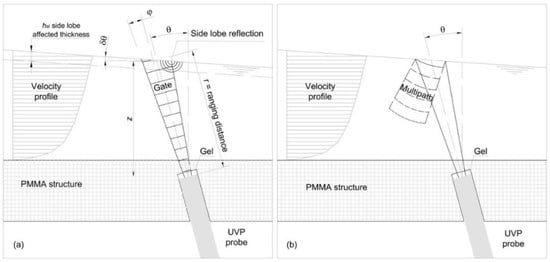 The water surface reflection also gave rise to a multipath effect (Figure 2b), corresponding to false positions of measured flow velocities, which were above the real free surface elevation. A portion of the acoustic energy bounced off at the water–air interface because of the strong impedance variation throughout the interface []. This gave rise to a reflected beam within the water depth, but with gates having longer path (i.e., with a delayed return to UVP) than the free surface depth. Hence, the corresponding velocity measurements appeared at longer distances in the UVP profile. This false positioning occurred for higher than two times the actual travelling time from the probe tip up to the free surface.