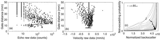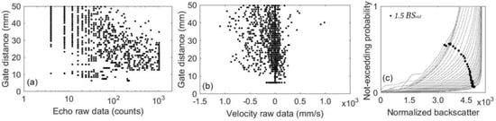 Velocity values at sampling time and gate were rejected for low normalized backscatter, which indicated insufficient signal return from suspended particles. This also corresponded to low signal to noise ratio, and in these cases, the volume backscatter is too low for a reliable estimation of the Doppler velocity []. The minimum threshold for the normalized backscatter was calibrated versus observed flow depths and overtopping discharges, as described in Section 4 and Section 5. This calibration resulted in rejecting the measurements with , not exceeding 1.5 times the corresponding at each cell. The probability of not exceeding a certain value of is reported in panels c of Figure 3 and Figure 4, which also shows the corresponding thresholds (i.e., black dots at 1.5 times ).