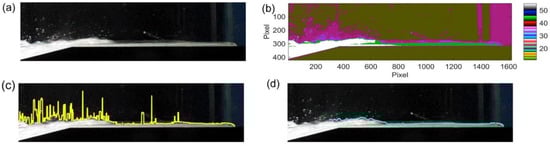 The overall reliability of the implemented image processing for the accurate detection of the free surface over the dike crest was verified at each test by overlapping the results with the corresponding frame, as it is also shown in Figure 5d.