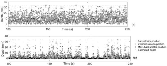 The values of h from UVP were generally detected at the gate with maximum backscatter, after an eventual profile re-alignment and filtering. When analysing the filtered profile of u, the farthest position of the gates where non-null velocity was measured (i.e., far-velocity position) and the barycentre of the validated values (i.e., velocities mean position) were derived. These outcomes can be compared to the estimated depths in Figure 6, which mostly corresponded to the maximum backscatter position with few exceptions in case of deteriorated profiles. In these cases, a clear peak in the backscatter profile was not detected or its height was typically much higher than the position of the remaining velocity data. For these noisy profiles (less than 10% of the validated), the velocities mean position was a more conservative estimate of the flow depth.