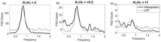 Since the two instruments were not triggered and were set with different sampling frequencies, the spectra of the water depths derived from the two analyses were compared in Figure 7, where each panel reports data for different values of Rc/Hs, while keeping constant the wave condition (Hs = 0.05 m and sm−1,0 = 3%) and the dike geometry (Gc = 0.30 m and cot(αoff) = 4). For all three presented cases, the power spectrum density (PSD) values of water depth at D1 position over the crest from images and from UVPs was calculated by using Welch’s overlapped segment averaging estimator [], and their values were characterized by similar peak amplitude. In the case of Rc/Hs = 0 (panel a), the spectrum density was observed to be concentrated in a band equal to ± 0.5 the wave peak frequency, with a good correspondence in terms of peak frequency between the two data. In case of Rc/Hs > 0 (panels b and c) instead, quantities of energy related to the mean overtopping rates were also present at low frequencies due to rare overtopping events during the test, which is also in accordance to the observations by [].