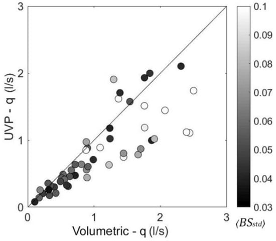 It is worth noting that low values of the normalized backscatter standard deviation (i.e., dark marks at the colour bar in Figure 8) resulted in better estimations of q. On the contrary, the UVP more significantly underestimated the assessed discharges in case of high (i.e., light marks). Indeed, the normalized backscatter standard deviation is a proxy of the UVP performance: Their high values give evidence of the probe saturation due to the strong sound reflection obtained from boundaries (i.e., the water-air interface), which disabled the volume scattering detection for Doppler velocimetry.