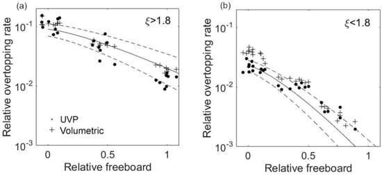 The time integral of wave-by-wave discharges obtained after the UVP filtering procedure provided values of q lower than the corresponding ones derived from cumulated volumetric measurements (Figure 8). The underestimation was slight (less than 10%) for low q in the case of emerged dikes (i.e., Rc/Hs = +1), but increased up to 50% for Rc/Hs = 0.