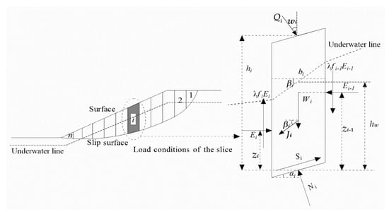 where Ri is the resistance force, and the unit is kPa; Ti is the sliding force, ; ψi is the transfer coefficient, ; ci is the effective cohesion for every rock slice and the unit is kPa; φi represents the shear strength angle for every rock slice, the unit is the degree. Ji is the seepage force of the rock slip which adopts a simplified seepage field treatment method, assuming that its position of action is located at the center of gravity of the rock below the underwater line, and the distance from the center of the slip surface of the rock strip is hwi/2, and hwi is the distance from the underwater line to the slip surface. Ei and Ei−1 are the horizontal effective forces between the two sides of the rock slice and the unit is kN; λfiEi and λfi−1Ei−1 are the shear forces between the two sides of the rock strip, fi is the function of the inter-strip force, and λ is the proportional coefficient. The distances between the action positions on both sides and the center of the slip surface of the rock strip are Zi and Zi−1, respectively; Wi is divided into two parts based on the underwater line: Wi = Wi1 + Wi2, where Wi is the gravity of the rock above the underwater line and Wi2 is floating weight of the rock below the underwater line. Qi is an external force on the rock surface; ωi is the angle between the direction of the external force and the normal direction; αi is the angle of the slip surface.