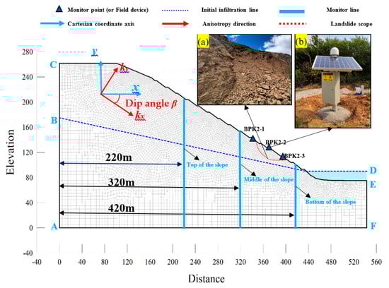 Equation (12) was adopted in this study [] with only the anisotropy ratio kr = ky/kx considered. However, for layered rock masses, due to the existence of dip angles of the bedding plane, the conditions that the anisotropy angle β was not equal to 0 were also considered. Therefore, in this study, to restore a reasonable rock formation state, anisotropy angles ranging between 0 and 90° in the layered rock slope in the Pulang area were taken into consideration. As shown in Figure 3, the anisotropic angle of hydraulic conductivity was equivalent to the dip angle of the layered rock slope.