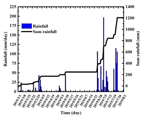 In Figure 3, the boundary conditions are as follows: AB and FD are the fixed water level boundaries of 175 and 90 m, respectively; CD indicates the boundary of the rainfall infiltration; BC is the free boundary with a limited flow; AF is an impervious boundary. Since the rock landslide occurred on 4 July 2019, to restore the rainfall boundary, the average daily rainfall from 1 March to 2 August 2019 (155 days) in the Pulang region was adopted as the simulated rainfall conditions, as detailed in Figure 4.