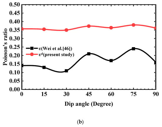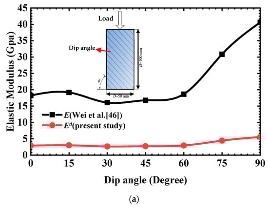In Figure 8, through the uniaxial compression experiment, the elastic modulus of the rock specimens with different dip angles is in the shape of “U”, reaching the maximum when the dip angle is 90°, and reaching the minimum when the dip angle is 30° []. The influence of dip angle variance on Poisson’s ratio was minimal [].