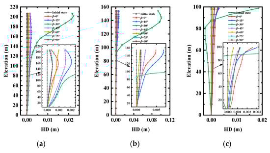 In Figure 9, the initial state is the distribution of the horizontal displacement (HD) of the rock slope before rainfall, and the remainder shows the distribution of the HD of day 155. The HDs of day 155 changed differently at different positions. At the top and middle of the slope, the HDs first increased and then decreased with the elevation. The maximum HDs at the top and middle of the slope were approximately 50 and 15 m from the surface, respectively. At the slope bottom, the HDs increased with elevation. The HDs at the bottom and middle of the slope were larger than the top of the slope. According to previous studies [,,], the hydrodynamic pressure generated by rainfall had a large impact on the bottom and middle parts of the slope, and the landslide between the bottom and middle of the slope, which verified the results of the numerical simulation. Generally speaking, the hydraulic conductivity and strength anisotropy characteristics also had great impacts on the variation of HD. When the dip angle β reached 30°, the HD reached the maximum. When the HDs at different positions of the rock slope reached the minimum, the corresponding dip angles of the rock formation were different.