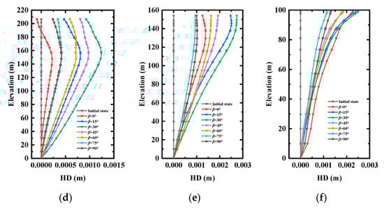 Based on the fluid–solid coupling theory, the layered rock slope produced the corresponding displacement under the action of the fluid. The seepage field exerted normal seepage pressure and tangential tension on the rock mass skeleton and affected the rock mass stress distribution. Under such stress conditions, the rock mass deformed accordingly. At the same time, the stress field affected the pores of the rock mass, and the hydraulic conductivity changed with the change of the pore size; thus, the stress field also affected the seepage field of the rock mass. According to the calculation conditions in Table 2, a total number of 70 numerical simulations was carried out, and 105 sections of horizontal displacement (HD) variation were obtained. The variations of the HD of layered rock slope with different β values and kr = 0.01 and kr = 0.1 are shown in Figure 9 to illustrate the influence of anisotropy direction β on deformation characteristics. Different kr values with β = 0, β = 30, and β = 90° are also displayed in Figure 10 to show the impacts of anisotropy ratio kr.