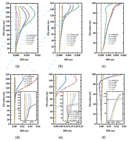 Horizontal displacement levels at different positions on the layered rock slope under different β values with kr = 0.01 and kr = 0.1: (a) Top of the slope with kr = 0.01; (b) middle of the slope with kr = 0.01; (c) middle of the slope with kr = 0.01; (d) top of the slope with kr = 0.1; (e) middle of the slope with kr = 0.1; (f) bottom of the slope with kr = 0.1.