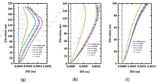 Horizontal displacement levels at different positions on the layered rock slope under different kr values with β = 0, β = 45, and β = 90°: (a) Top of the slope with β = 0°; (b) middle of the slope with β = 0°; (c) bottom of the slope with β = 0°; (d) top of the slope with β = 30°; (e) middle of the slope with β = 30°; (f) bottom of the slope with β = 30°; (g) top of the slope with β = 90°; (h) middle of the slope with β = 90°; (i) bottom of the slope with β = 90°.