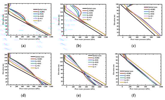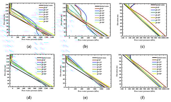 Pore water pressure levels at different positions on the layered rock slope under different β values with kr = 0.01 and kr = 0.1: (a) Top of the slope with kr = 0.01; (b) middle of the slope with kr = 0.01; (c) middle of the slope with kr = 0.01; (d) top of the slope with kr = 0.1; (e) middle of the slope with kr = 0.1; (f) bottom of the slope with kr = 0.1.