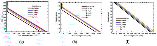 Pore water pressure levels at different positions on the layered rock slope under different kr values with β = 0, β = 30, and β = 90°: (a) Top of the slope with β = 0°; (b) middle of the slope with β = 0°; (c) bottom of the slope with β = 0°; (d) top of the slope with β = 30°; (e) middle of the slope with β = 30°; (f) bottom of the slope with β = 30°; (g) top of the slope with β = 90°; (h) middle of the slope with β = 90°; (i) bottom of the slope with β = 90°.