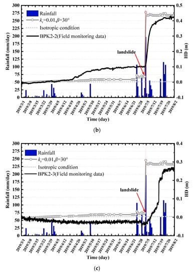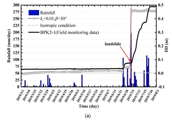 The variations of horizontal displacement for the monitoring point of the layered rock slope during rainfall are shown in Figure 13. BPK2-1, BPK 2-2, and BPK 2-3 were the field monitoring data obtained by the displacement monitoring station. As a landslide occurred just near the field station during the monitoring activity, the deformation behavior of the rock slope could be detected []. In correspondence to the rainfall event of 4 July 2019 (day 91), the monitoring point of the rock slope experienced a sudden increase in horizontal displacement. Through numerical simulations, it was found that the HD of the monitoring point was underestimated when the rock slope was considered isotropic, compared to anisotropy during the rainfall period. Under varied kr and β, the HDs calculated by numerical simulations all increased abruptly on 4 July 2019, indicating that the rock slope model could accurately predict the occurrence time of the landslide. It is worth noting that when kr = 0.01 and β = 30°, the calculated HD was consistent with the field monitoring data.