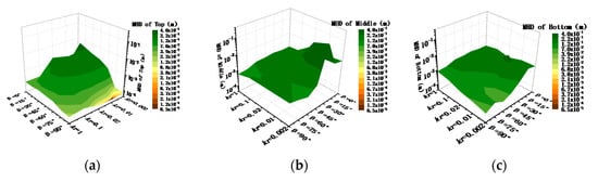 Variations in the maximum horizon displacement (MHD) at the different positions of the slope: (a) MHD of the top of the slope; (b) MHD of the middle of the slope; (c) MHD of the bottom of the slope.