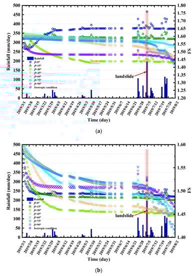 - The changing law of the anisotropy ratio was not obvious, and it was difficult to verify by field data. This could be a focus of future research work. The obtained results are likely to provide a theoretical basis for the prediction and monitoring of layered rock landslide.