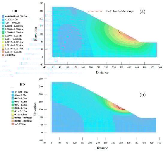 Cloud map of horizontal displacement of rock slope when landslide occurs (day 91): (a) Isotropic (kr = 1); (b) kr = 0.01, β = 30°.
