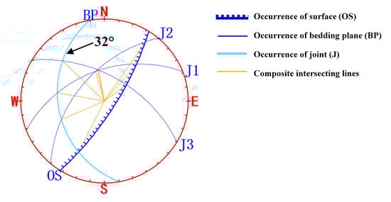 The strength parameters of seriously weathered rock slopes like the elastic modulus and Poisson’s ratio were obtained by the conversion Equations (13)–(15). Through numerical simulations, the anisotropic rock slope model could predict the time of landslide occurrence. Figure 18 shows the cloud map of the horizontal displacement when the landslide occurred on 4 July 2019 (day 91). It could be found that when kr = 0.01 and β = 30°, the simulated landslide scope almost coincided with the field landslide scope. When the rock slope was regarded as a homogeneous medium (kr = 1), the distance between the simulated landslide scope and the field landslide scope was about 45 m, and the horizontal displacement was significantly small, which made it difficult to predict the occurrence of the landslide. According to the field survey, the field dip angle of the rock slope was 32°, as shown in Figure 19, which was similar to the dip angle of 30° in the simulation. Thus, in general, the landslide scope, horizontal displacement, dip angle, and landslide occurrence time of the field investigation were consistent with the results of the simulation. Therefore, the feasibility of the conversion Equations (11)–(14) of elastic modulus and Poisson’s ratio was also verified.