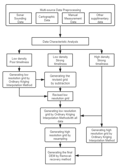 When there is significant variation in density among different topographic data, interpolation with no pretreatment can produce false values, due to the interference of high-density data on low-density data. Therefore, it is necessary to adopt an appropriate data fusion method to achieve both retaining the details of high-density data and avoiding abnormal false values caused by the impact on low-density data areas. The removal-recovery method can effectively solve this problem. Forsberg and Tscherning demonstrated and deduced the method in detail and applied it to construct a gravity field model [26]. Subsequently, Hell and Jakobsson applied it to construct a multi-source seabed topographic model and achieved good results [27].