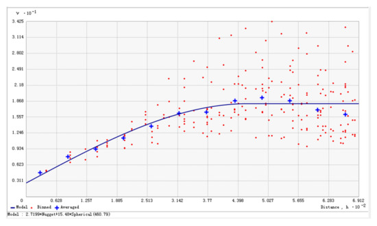 It can be seen that pairs of locations that are closer have more similar values. As pairs of locations become farther apart, they become more dissimilar and have a higher squared difference. The nugget is 2.7199, the major range is 460.79, and the partial sill is 15.4802. The ratio of nugget to sill is 14.94%, means that the system has a strong spatial correlation.