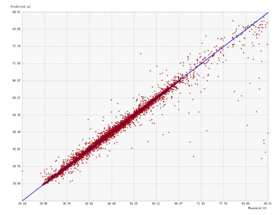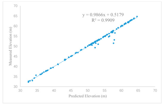 In order to verify the reliability of the final updating terrain, we use the topographic data measured by the project team in the reservoir site to verify the results (Figure 11). These were the latest field survey data of the project team in 2017, which was not used in the calculation of terrain simulation. First, we overlay the measured data points with the DEM of the base terrain of the simulation results by georeferencing. Then, we extract the simulated elevation values at the corresponding locations to the points. Finally, we analyze the correlation between the simulated elevation value and the measured one of each data point. The results are shown in Figure 12. Meanwhile, the mean error and root mean square error (RMSE) between the simulated and measured values of the selected verification points are calculated (Table 1), which is used to analyze the accuracy of the terrain simulation.