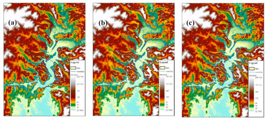 As mentioned before, the terrain simulation method based on multi-source data fusion has been widely used in marine areas. On the basis of existing methods, in this paper, we proposed an improved multi-source data fusion method, which considered the distinctive characteristics of reservoir topography. To test the difference between this improved method and other terrain simulation methods, the widely used ordinary kriging interpolation method and the existing multi-source data fusion method applied in the marine field, were used for terrain interpolation in the reservoir area [30,31]. The ordinary kriging method was based on the spherical semi-variogram model, and the parameter, nugget, and partial sill were optimized by using the Geostatistical Analyst tools in ArcGIS. The results of the three methods are shown in Figure 9.