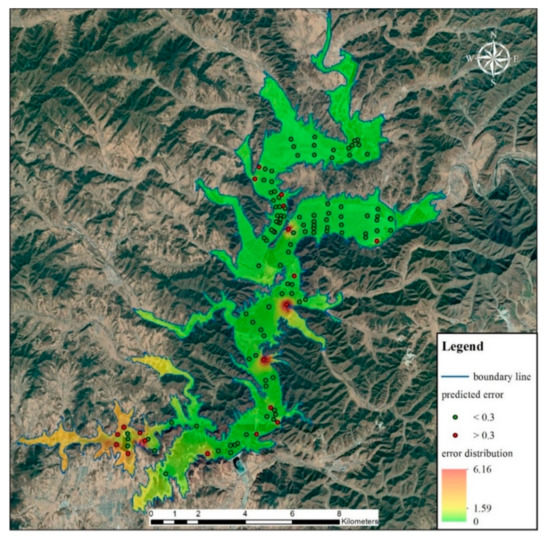 The first type distributes in the water-land boundary area of the reservoir margin. Because the reservoir margin is mostly steep mountain slopes and the elevation change rate in this area is great, the interpolation error increases accordingly. In addition, because the old topographic map was produced a long time ago, there were some errors in georeferencing with new data. Generally, the closer to the boundary, the lower the accuracy of georeferencing. Those factors lead to the larger simulation errors of such points.