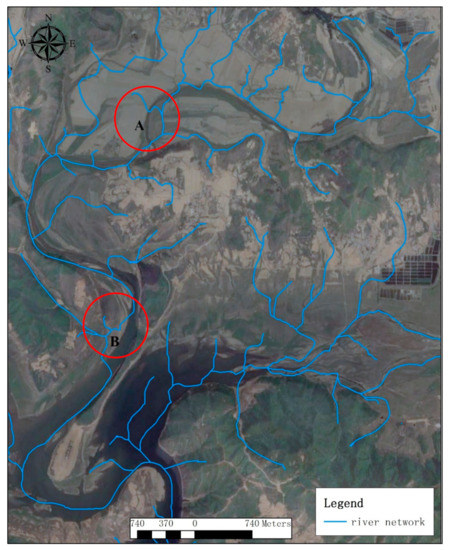 Contrast between the satellite image and the river network of the updated terrain (locations A and B: the examples for deviations).