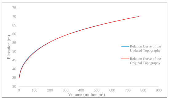 The elevation and volume relation curves of the original and the updated topography.