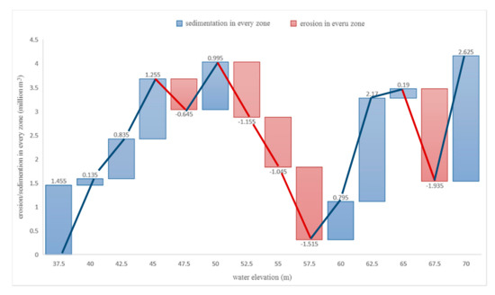 Furthermore, the difference curve could be used to roughly infer the total volume of siltation. By examining the historical water level data of the reservoir, we found that the highest water level was 69.67 m. The volume difference under 69.67 m could be regarded as the total siltation in the reservoir, which was 4.3 million m3 according to the difference curve. It can be seen that the volume difference fluctuates with the change of water level (Figure 15), which is caused by silting or erosion in the different areas of the reservoir. We divided the water level into 14 zones. The volume of sedimentation/erosion in each zone is shown in Figure 16. It is noted that the negative values refer to the volume of erosion and the positive values refer to the volume of siltation. Correspondingly, the spatial distribution of erosion/sedimentation in the reservoir is shown in Figure 17.