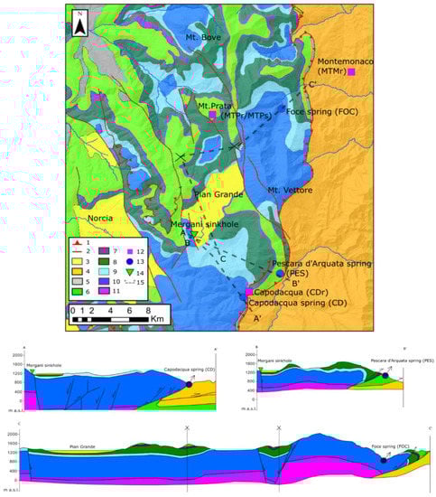 Hydrogeological sketch of the study area and location of the monitoring points. 1. Thrust fault; 2. Normal fault; 3. Alluvial and lacustrine deposits (Holocene-Pliocene); 4. Clay and sands units (Miocene); 5. Calcareous Marly units (Miocene-Eocene); 6. Scaglia Calcarea (Eocene-Cretaceous); 7. Marne a Fucoidi (Lower Cretaceous); 8. Maiolica (Lower Cretaceous-Jurassic); 9. Calcareous siliceous marly units (Upper Jurassic); 10. Corniola-Calcare Massiccio (Lower Jurassic); 11. Anidriti di Burano (Triassic); 12. Rain gauges and snow thickness gauge (see Table 1); 13. Spring discharge station with fluorimetric probes; 14. Tracer injection point. 15. Hydrogeological section. All the cross-sections are modified from the literature [29,38].