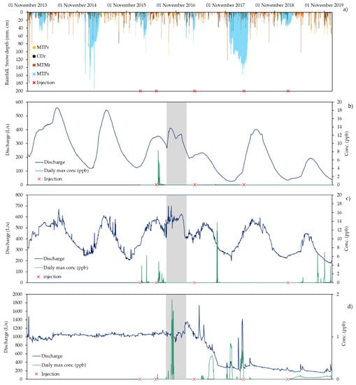 After a denoising procedure on the tracer arrival signal recorded by the fluorimetric probes located in the monitored points, a quantitative analysis has been performed by Qtracer2 ver. 2, free software for carbonate aquifers (i.e., karst and fractured) tracer tests interpretation [41]. Using Qtracer2 is possible to identify the first arrival of tracers at the springs and calculate the minimum and maximum velocity. It is also possible to identify other arrivals of tracer on the monitoring points and calculate the flow characteristics. The output obtained by Qtracer2 and the maximum daily concentration expressed in ppb of tracer recorded in each monitoring point (Figure 1) was related to the rainfall and snow depth recorded at MTPr and MTPs, respectively, and the spring discharge in each monitoring point (PES, CD, and FOC) (Section 3.2).