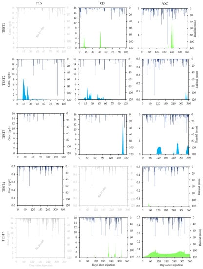 Comparison between tracer concentration expressed in ppb vs days after injection in the monitoring points and rainfall recorded at MTPr during the five analysed tests. The green area represents the Fluorescein, while the blue one the Tinopal CBS-X. When the fluorimetric probe was not installed in a specific spring during a specific test, the corresponding graph is represented in light grey, and the expression “No Probe” is added in the figure.