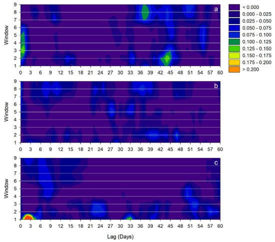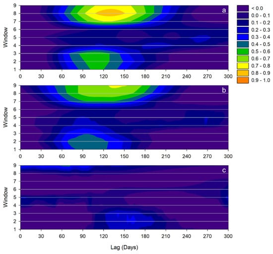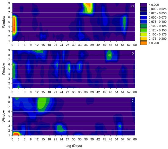 Contour graphs that represent variations in the curve shape of the high-elevation rainfall/residual spring discharge CCFs, over the whole period (i.e., among the sliding windows shown in Table 5). (a) MTPr/resPES; (b) MTPr/resCD; (c) MTPr/resFOC. The positive correlation value corresponding to the 95% significance level (p < 0.05) is 0.06.