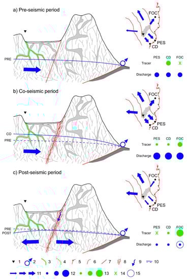 Schematic conceptual model. On the left, hydrogeological cross-sections (not in scale); on the right, plan views of the analyzed springs and recharge area (not in scale). In legend: (1) tracer injection point (i.e., Mèrgani sinkhole); (2) spring; (3) tracer; (4) diluted tracer; (5) thrust in plan views; (6) normal fault in plan views; (7) tectonic structures in cross-section; (8) co-seismic ruptures; (9) rainfall infiltration; (10) piezometric levels; (11) Basal aquifer main groundwater flow direction (the symbol size is proportional to the quantity: low, intermediate, high); (12) spring discharge (the symbol size is proportional to the quantity: low, intermediate, high); (13) recovered tracer (the symbol size is proportional to the quantity: low, intermediate, high); (14) tracer not recovered; (15) strong discharge response to intense rainfall events.