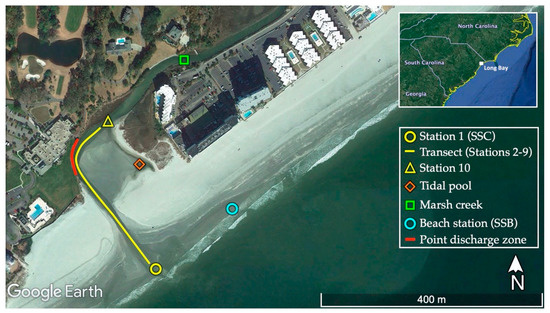 The primary channel was sampled along a 10-station transect on four dates: 31 August 2018; 17 November 2018; 22 January 2019; and 14 April 2019. Every sampling event started at the oceanward-most station 1 (also designated SSC, shown as a yellow circle) at the location where the primary channel emptied into the swash zone on each specific date. An additional nine stations spaced 30–50 m apart were sampled along the primary channel (shown as a yellow line in Figure 1) and always ending at the landward-most station 10 (33°45.453′ N, 78°47.669′ W, shown as a yellow triangle in Figure 1) where the marsh tidal creek enters the swash’s sandy terminus.