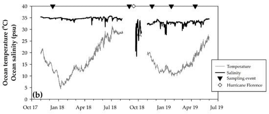 Long Bay (South Carolina), in which the primary channel empties, is a shallow microtidal mixed-energy, open-ocean embayment that is subject to diffuse discharges from multiple creeks and inlets like Singleton Swash [8]. Climatological characteristics for the duration of the study period are shown in Figure 2. Atmospheric temperature and daylight duration show typical seasonal variation, while precipitation records document several intense rainfall events, especially the one associated with Hurricane Florence in September 2018. The effect of this event is noticeable in the below-normal coastal-ocean salinities documented at a nearby pier monitoring station (Figure 2).