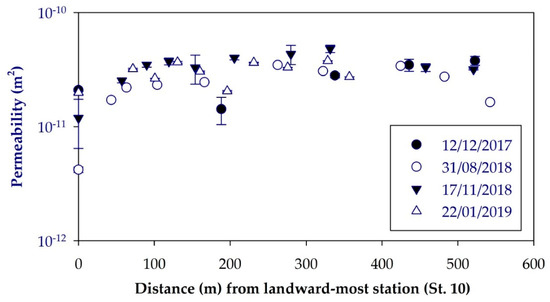 Permeability was determined by the constant-head method [26,27]. Grain size distribution was determined by wet sieving and the mean grain size (mm, phi), median grain size (mm, phi), sorting (phi), and skewness (dimensionless) were determined by the statistical definitions in [28].