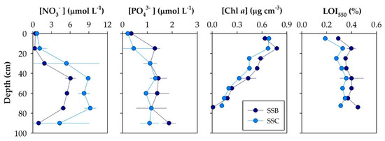 Pore-water nitrate and phosphate and solid-phase Chl a and loss-on-ignition at 550 °C (LOI550) profiles collected from the Singleton Swash beach monitoring station (SSB) and the location of the creek’s discharge into the ocean (SSC) on 29 August 2018.