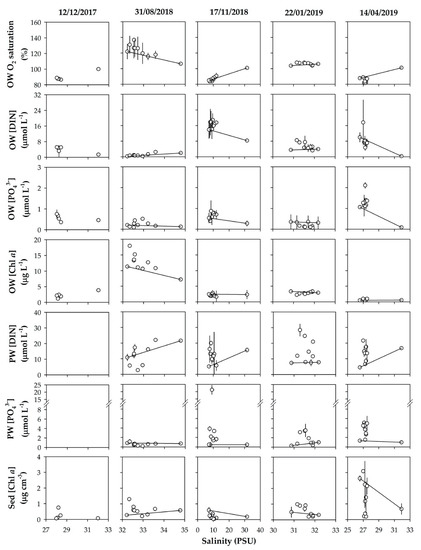 Data were explored graphically using SigmaPlot (Systat) and statistically using SPSS (IBM) by suitable statistical methods [37]. Property–property plots, including the salinity vs. concentration plots used in the conservative mixing analysis, were generated using the averages (and standard deviations) of each property at each station on each sampling date. One-way ANOVA was used to determine if significant differences in the concentrations of O2, nutrients, and Chl a existed between seasons as well as between the sedimentary and overlying water environments (significance level of 0.01).